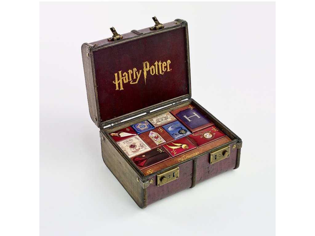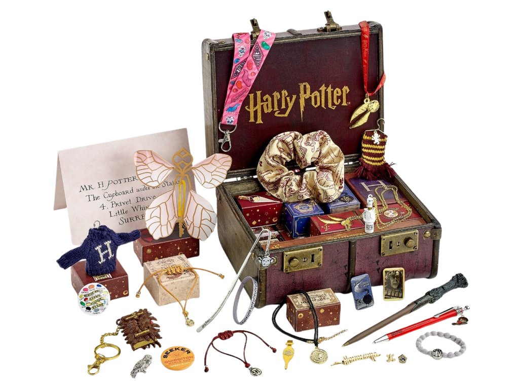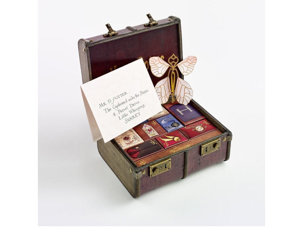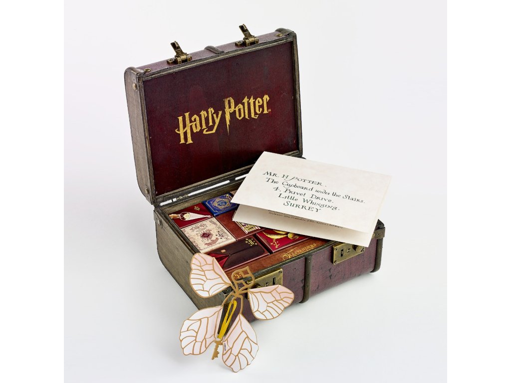 Překvapení jsou ukryta v malých papírových krabičkách ve stylovém kufru. Obsahuje exkluzivní šperky, gumičku, klíčenku, přívěsky, originální psací potřeby a další. Po otevření dopisu doslova vyletí ven okřídlený klíč.