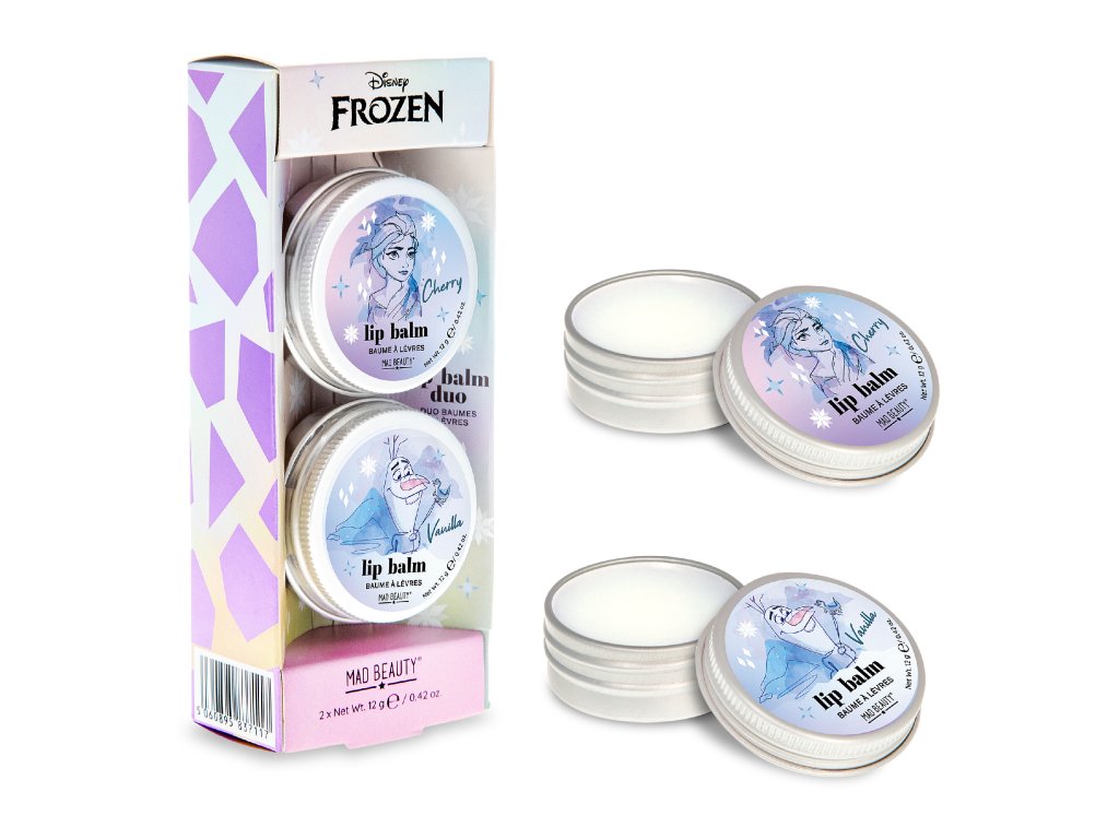 Balzám na rty 2x12g, Frozen, vůně: třešeň a vanilka. Zanechává rty hebké a jemné, zajišťuje rtům ochranu před vnějšími vlivy, poskytuje suchým rtům okamžitou úlevu. Je nezbytným pomocníkem pro každodenní péči o citlivou pleť rtů ve všech ročních obdobích. Naneste na rty kdykoli během dne dle potřeby. Naneste na rty samostatně nebo jako podklad pod rtěnku.