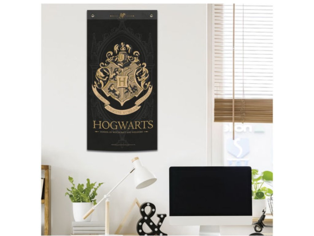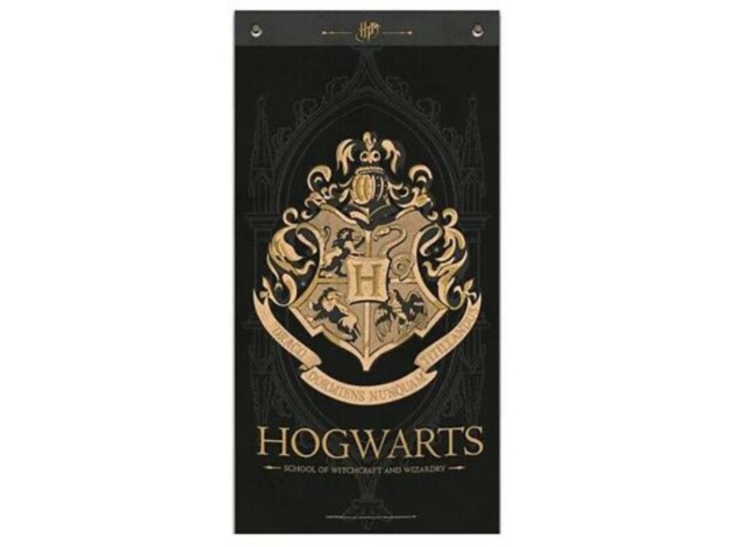 Velký černý prapor (vlajka) na zeď se znakem Školy čar a kouzel v Bradavicích.