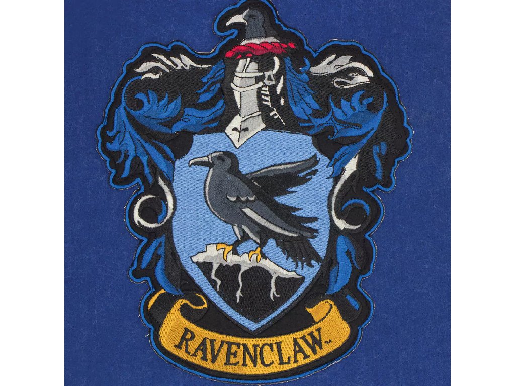 Modrá vlajka s erbem havraspárské koleje ze školy čar a kouzel v Bradavicích.