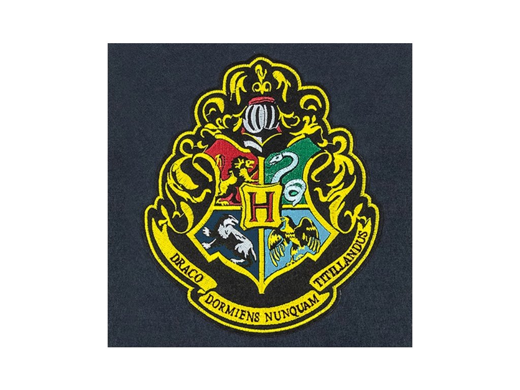 Černá vlajka s erbem bradavické školy čar a kouzel (Hogwarts).