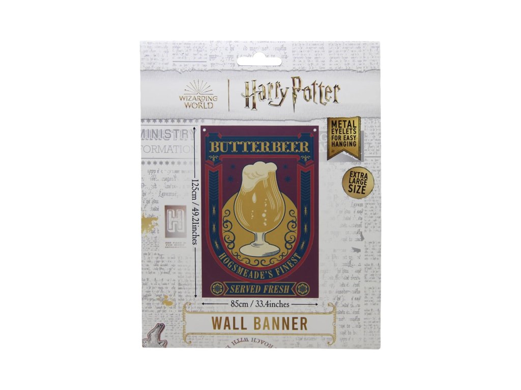 Velký látkový banner inspirovaný slavným kouzelnickým nápojem - Máslovým ležákem - který bohatě vyzdobí každou domácnost. Lze pověsit na zeď, k čemuž slouží kovová očka ve vrchních rozích banneru.