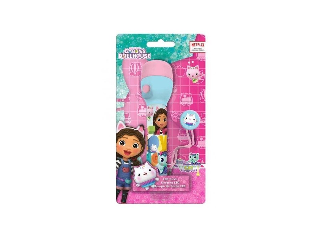 Ledková plastová baterka s motivem Gábinin kouzelný domek. Funguje na 2 baterie LR6 AA (nejsou součástí).