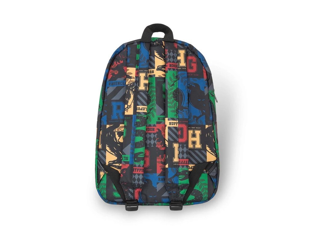Atraktivní černý školní batoh s malou přední kapsou, barevným motivem všech čtyř školních kolejí a grafikou Harryho Pottera je ideální pro fanoušky této kouzelnické ságy. Díky nastavitelným popruhům a pohodlnému uchu pro nošení v ruce je vhodný pro jakéhokoli fanouška, malého či velkého.