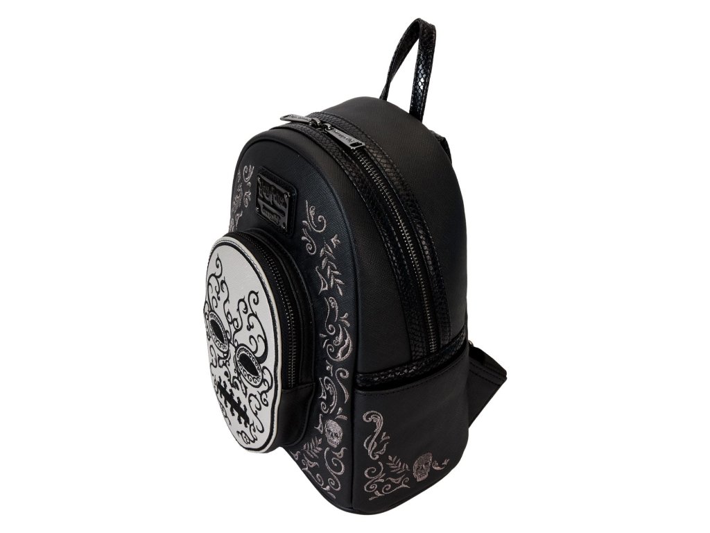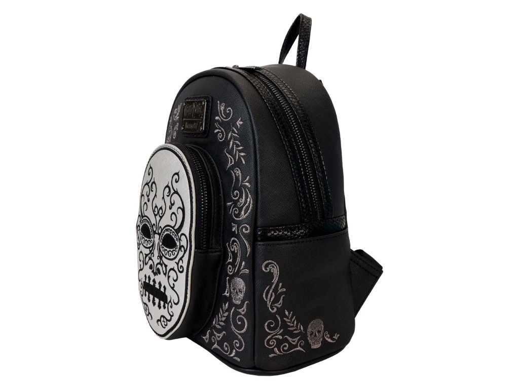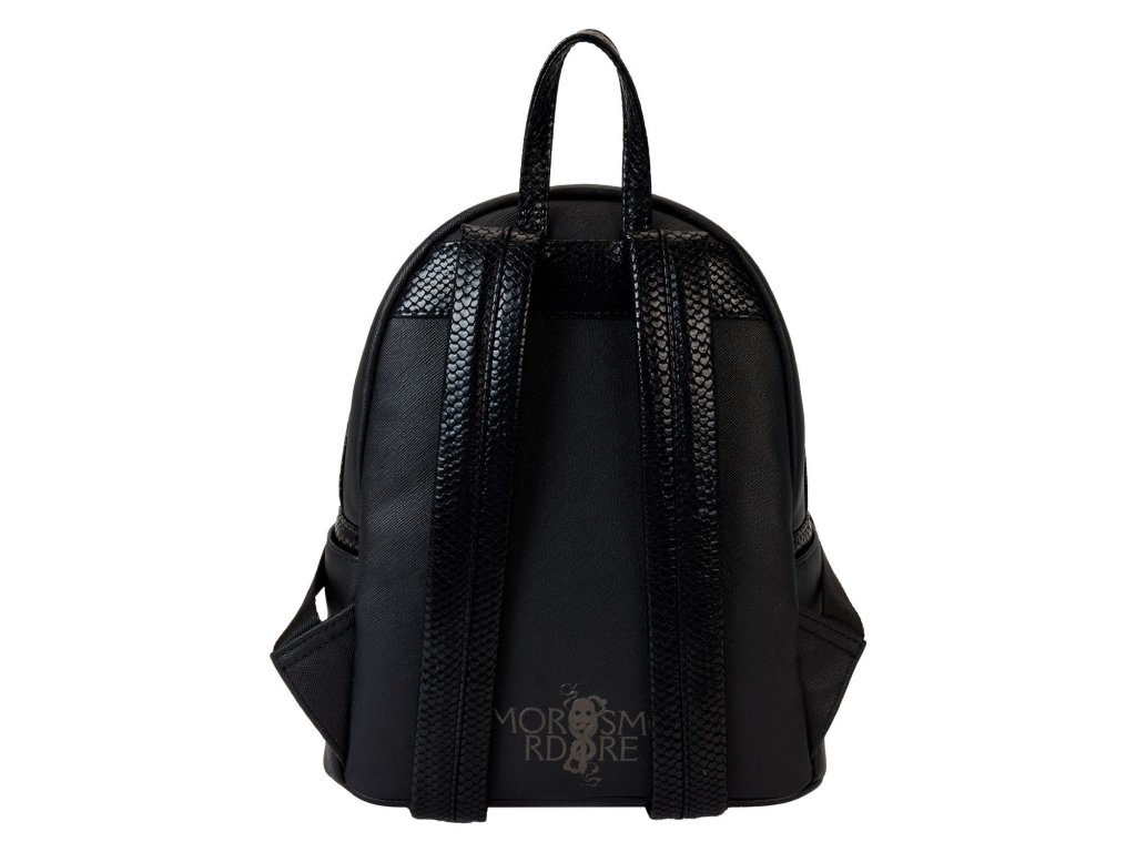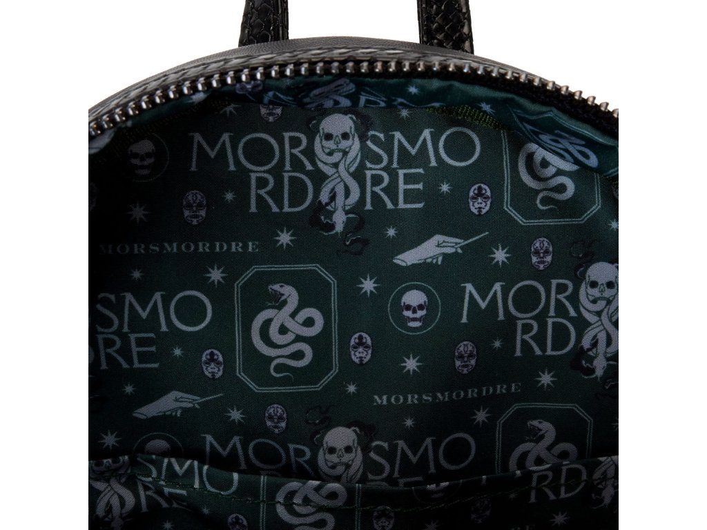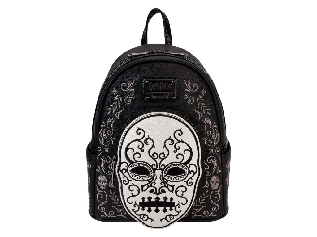 Batůžek je vyroben z veganské kůže (polyuretan), kromě hlavního velkého prostoru má praktickou přední přihrádku a boční kapsy, nastavitelné ramenní popruhy a temnou potištěnou vnitřní podšívku. Na přední kapse batoh zdobí velká maska smrtijeda.