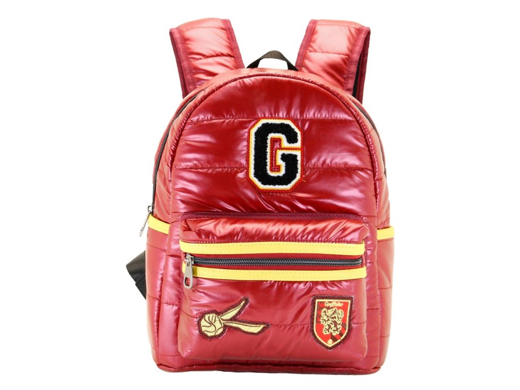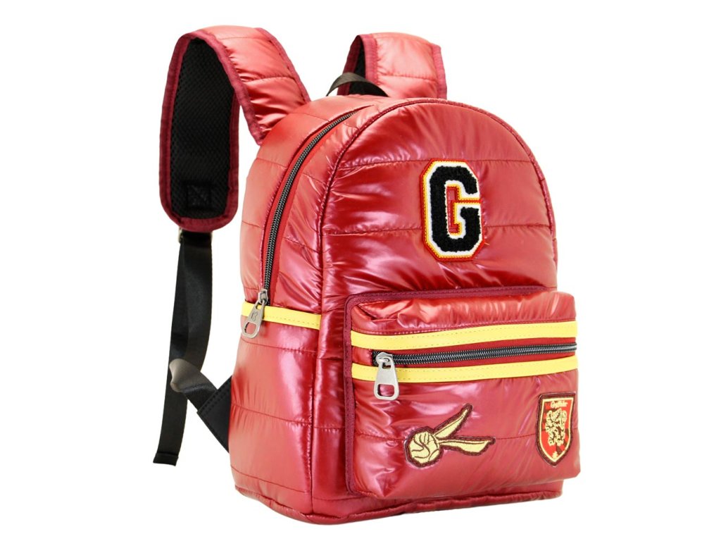 Batoh je zdobený černým písmenem G, Zlatonkou a erbem bradavické koleje Nebelvír.