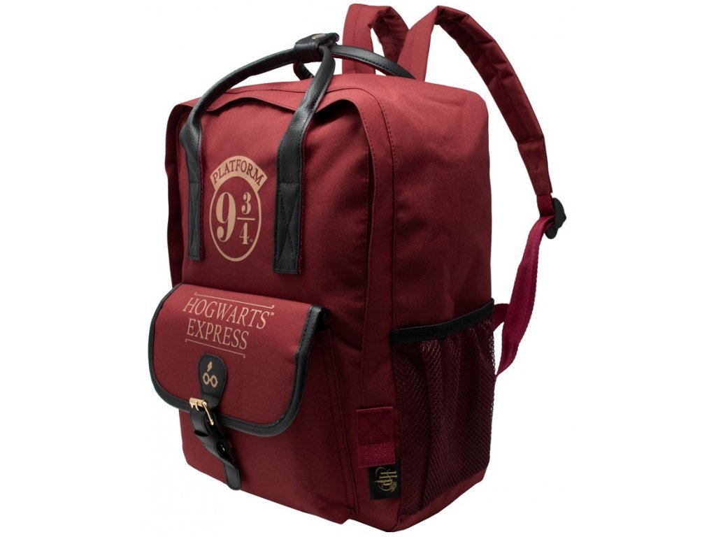 Červený jednoprostorový batoh s přední kapsou s motivem Hogwarts Express (nástupiště 9 3/4) ze ságy Harryho Pottera.