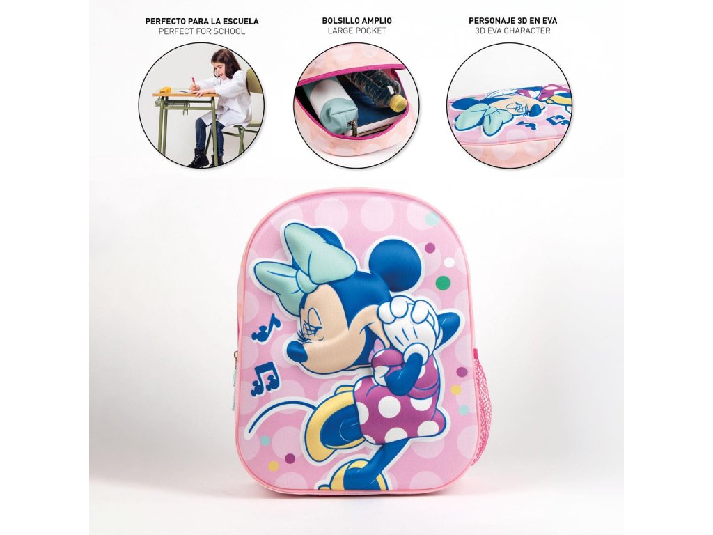 Dětský 3D růžový batoh s motivem Minnie potěší malé fanoušky Mickey Mouse. Nabízí dostatek prostoru pro školní potřeby nebo drobnosti a hravý 3D design dodá každému dni veselý a roztomilý nádech.Doplňkové parametry