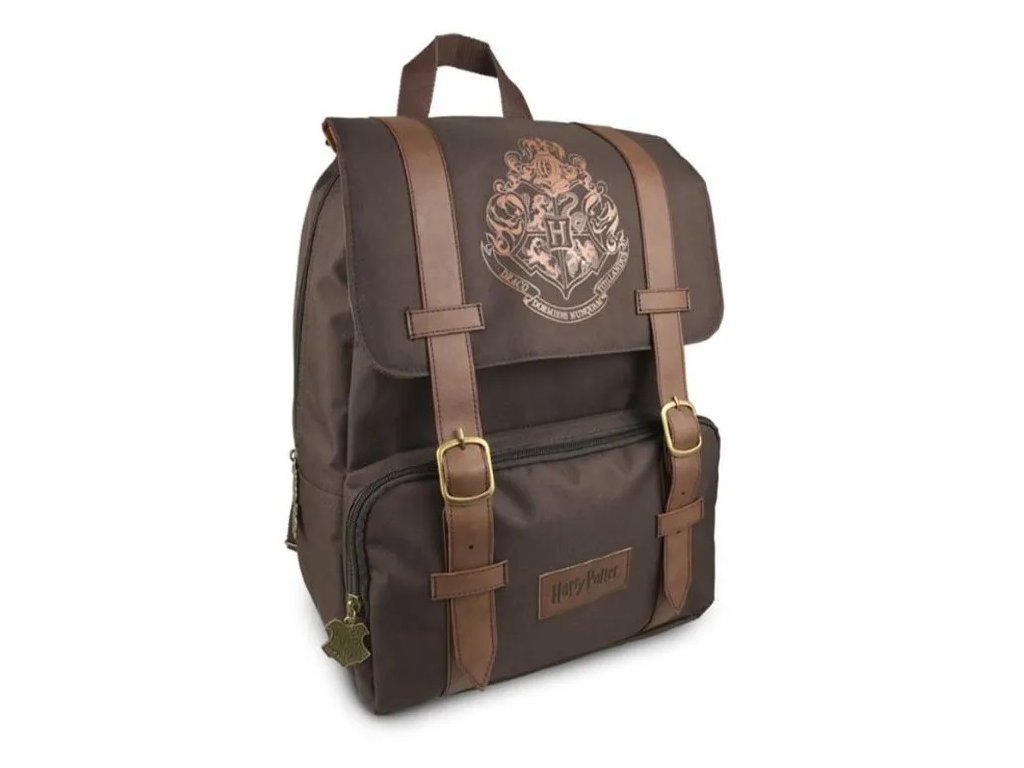 Atraktivní hnědý batoh se zapínáním na cvoky přes batoh se znakem školy čar a kouzel v Bradavicích (Hogwarts) z populárního kouzelnického příběhu Harryho Pottera.
