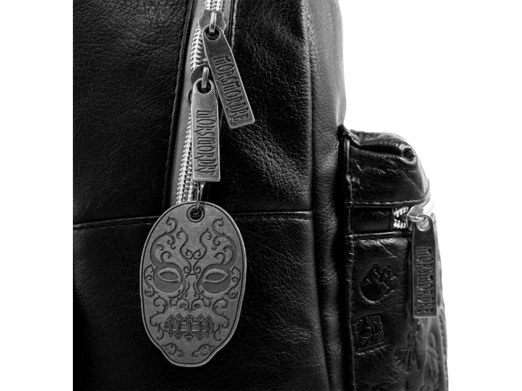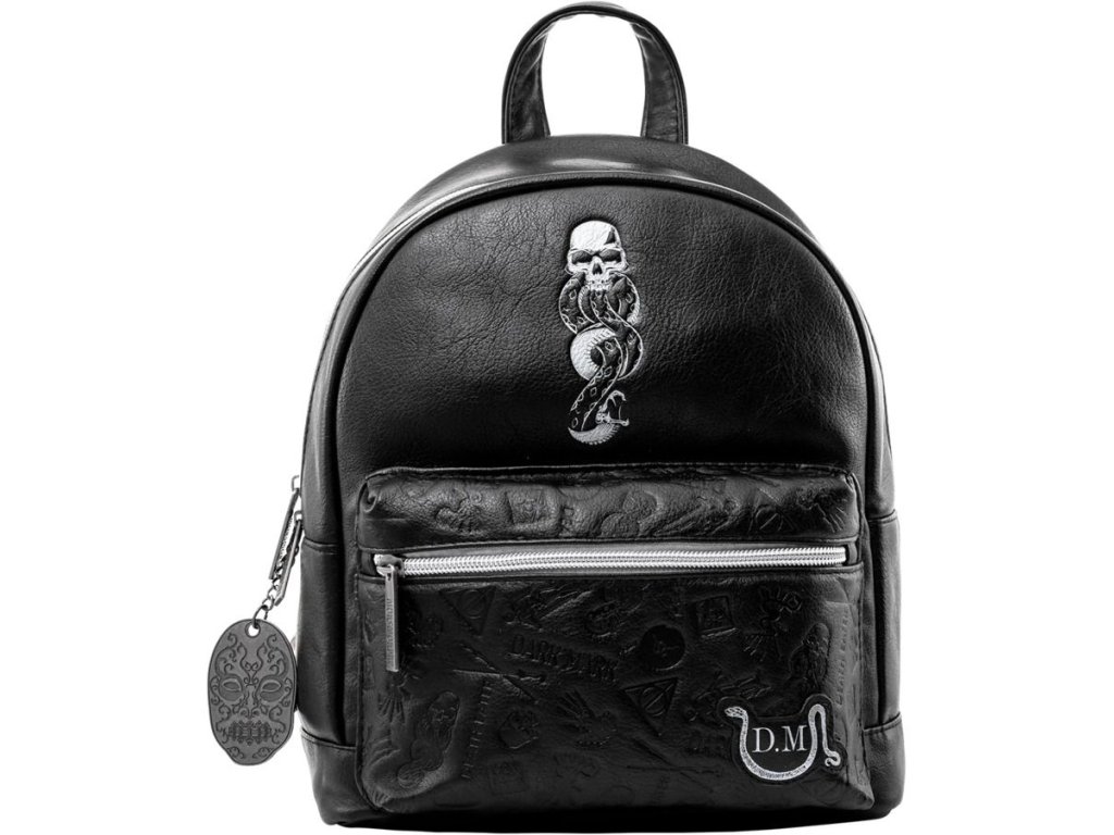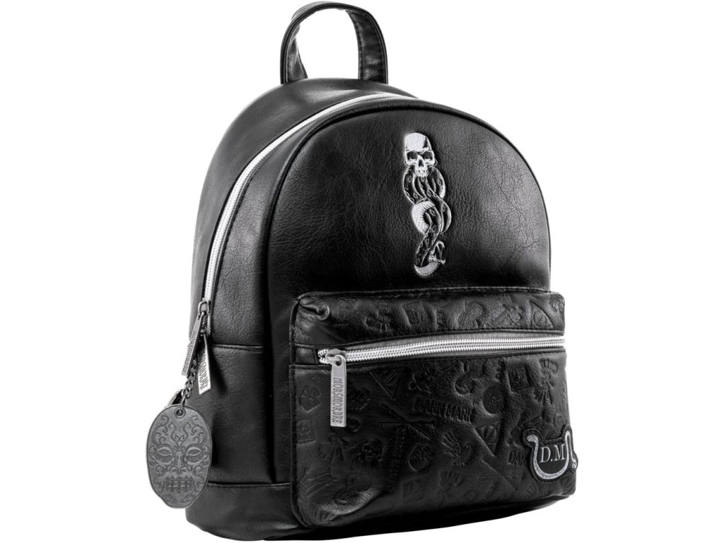 Krásný koženkový batoh v designu temné magie (Dark Arts), který je stylizovaný do černo-stříbrných barev. Na přední straně je majestátní znak Znamení zla. Batoh obsahuje dvě přihrádky na ukládání věcí, zapínání zdobí kovový přívěsek v podobě masky Smrtijedů.