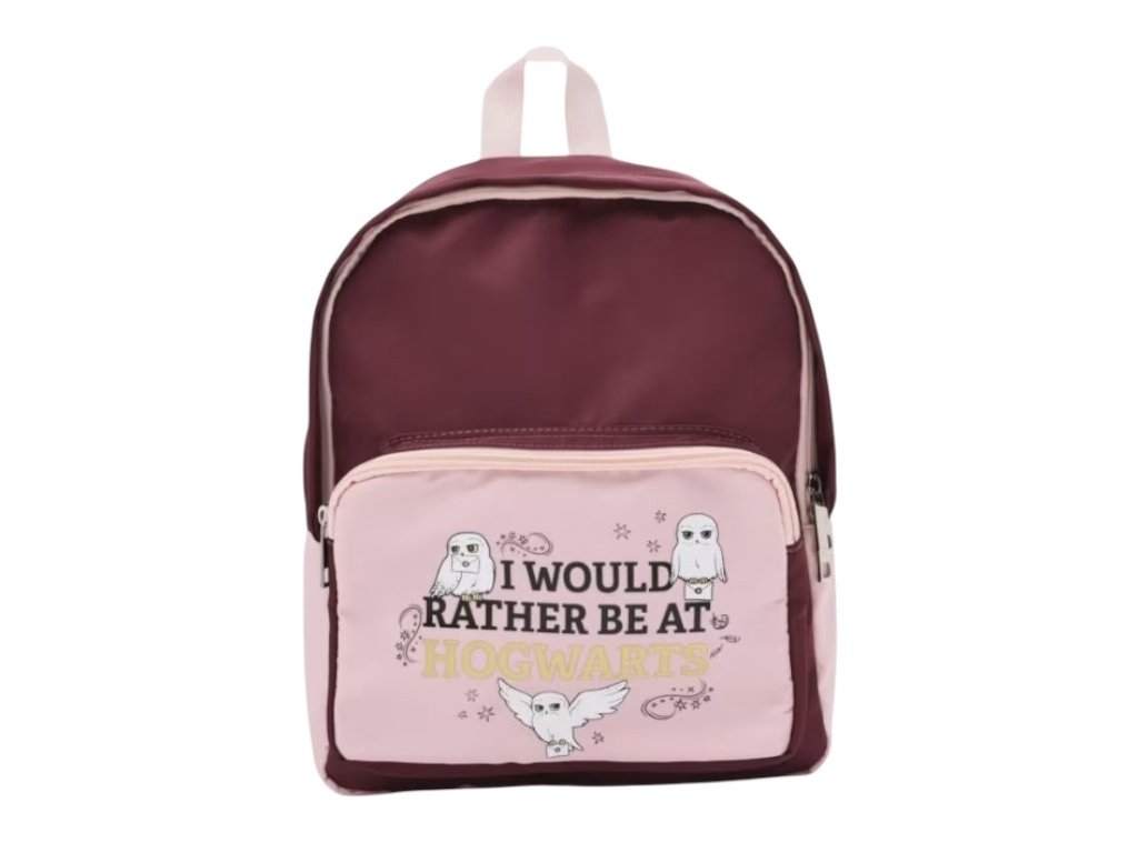 Růžový batůžek vhodný pro všechny malé fanynky Harryho Pottera a jeho mazlíčka, sovy Hedviky.