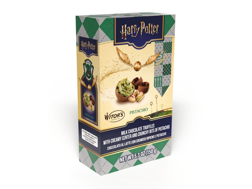 Okuste kouzlo světa čar a s touto luxusní čokoládovou pochoutkou. Čokoládové pralinky ve tvaru Zlatonky jsou plněné krémovou pistáciovou náplní a kousky pistácií, což přináší sladký a jemně křupavý zážitek pro všechny fanoušky kouzelnické ságy.