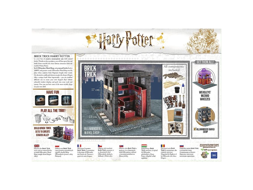 Skládejte cihlu za cihlou, řežte a lepte prkénka, postupujte od základů až po dokončenou budovu a nakonec svůj výtvor ozdobte přiloženými dekoracemi. Výrobek můžete kombinovat s dalšími sadami ze série Brick Trick Harry Potter a vytvořit tak komplex staveb ze světa čar a kouzel včetně hradu v Bradavicích.