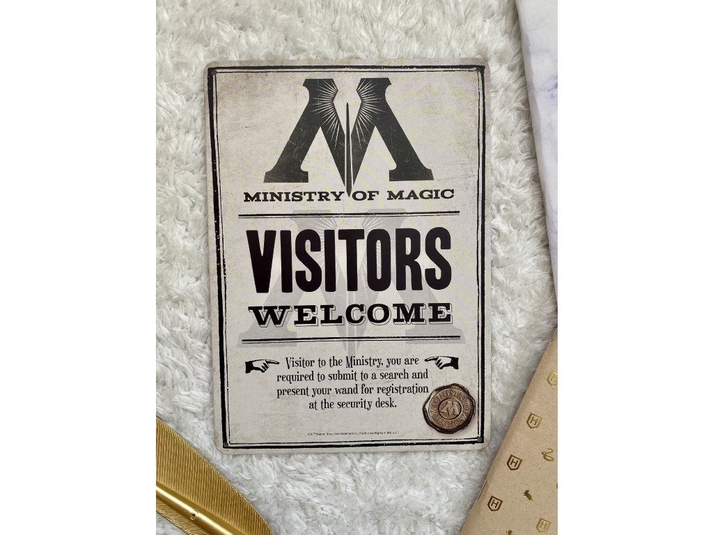 Béžová dekorativní cedulka na zeď s grafikou Ministry of Magic (Ministerstvo kouzel) z knižní a filmové sci-fi ságy Harry Potter.