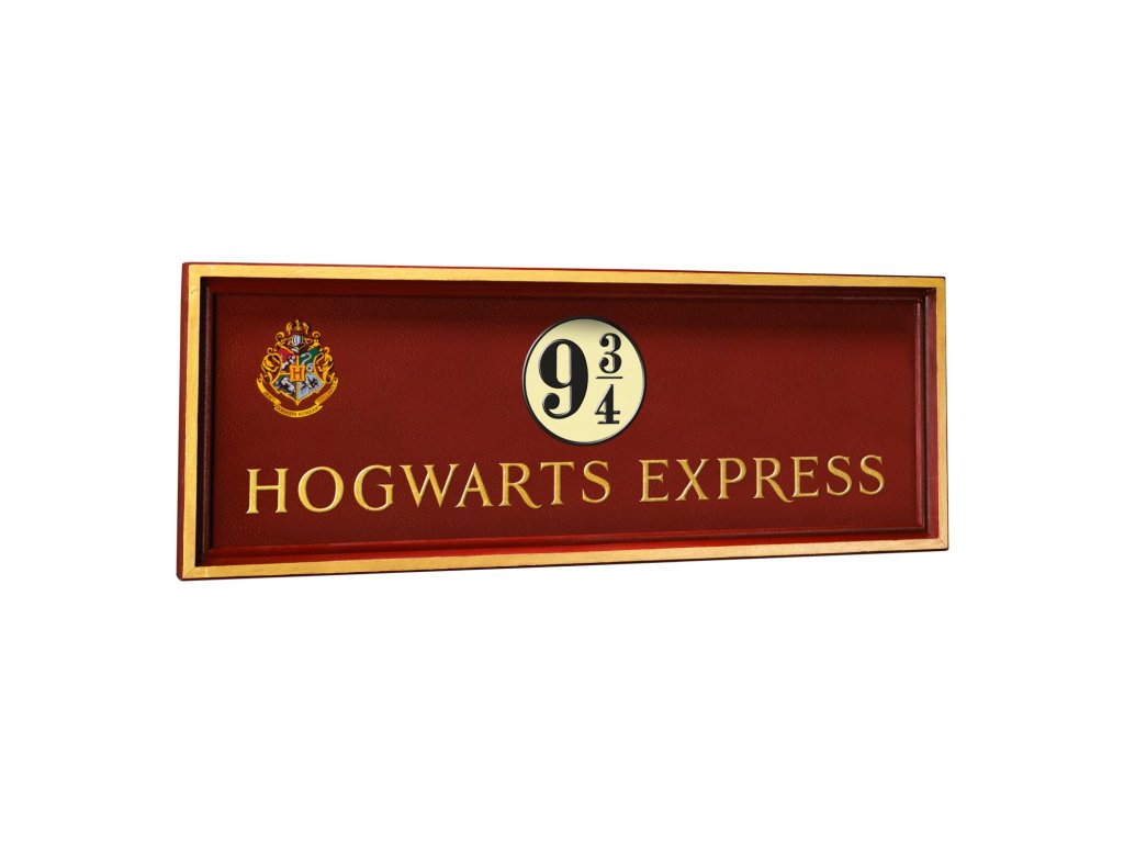 Dřevěná replika nápisu slavného kouzelnického Nástupiště 9 a 3/4, kde studenti nastupují do Bradavického expresu, který je odváží do Školy Čar a kouzel v Bradavicích.