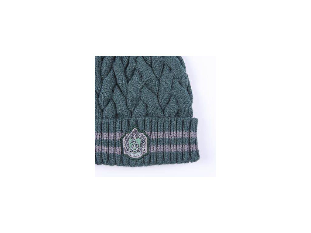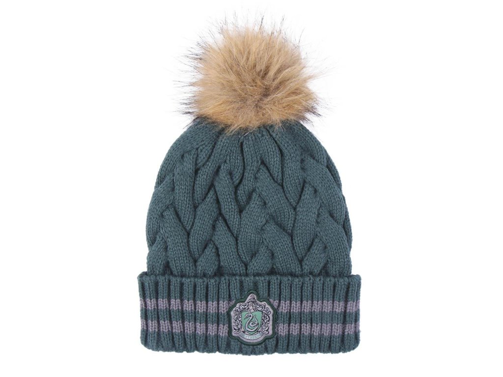 Zimní čepice ve stylu zmijozelské koleje s erbem a nápisem Slytherin.
