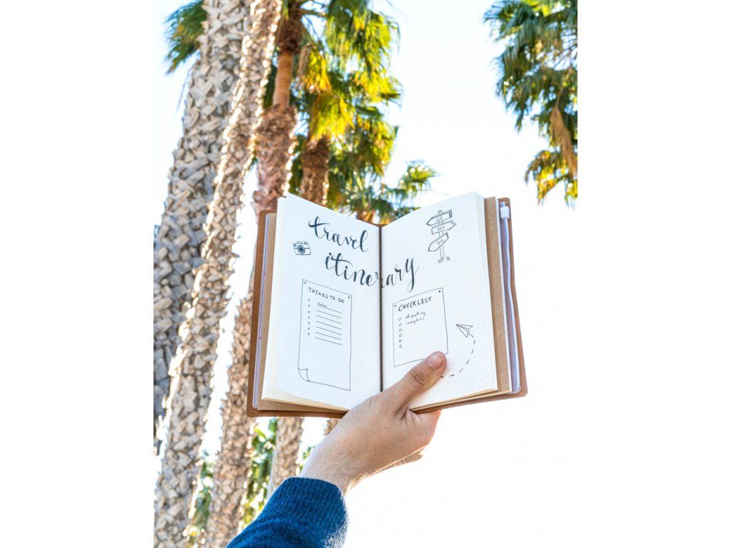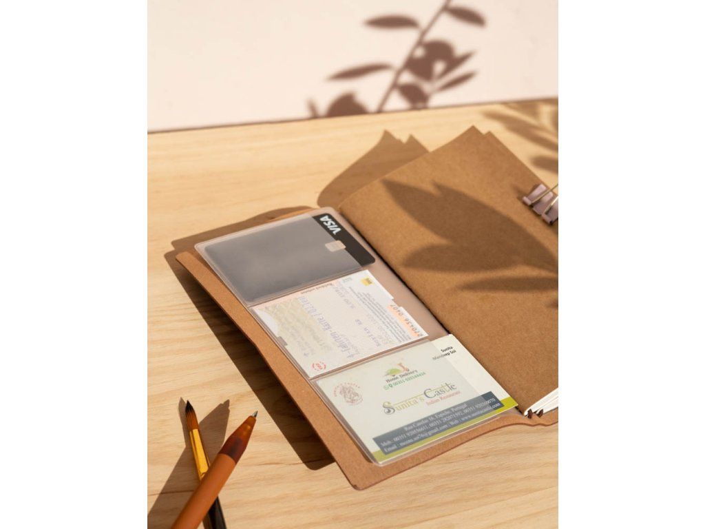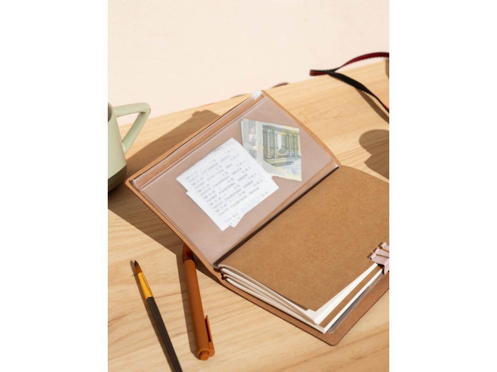 Cestovní zápisník s měkkým polyuretanovým obalem. Obsahuje prostor na karty, dva vyměnitelné sešity s 80 listy (160 stran) a dvěma různými typy listů (s odrážkami a linkovanými) a kapsu na vnitřní straně zadní strany. Má gumičku a polyuretanové zapínání. Obálky měří 12 x 19,5 cm a vnitřní strana 10,5 x 18,5 cm.Doplňkové parametry