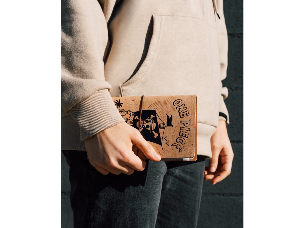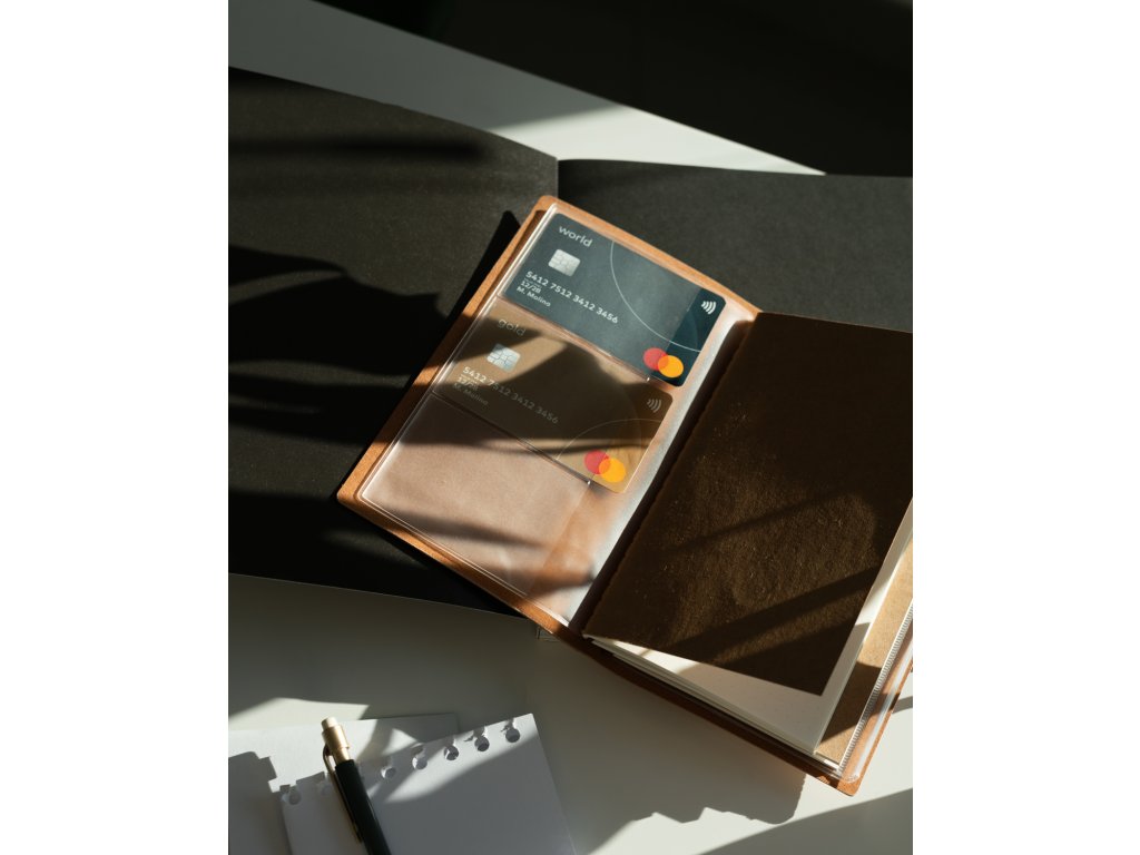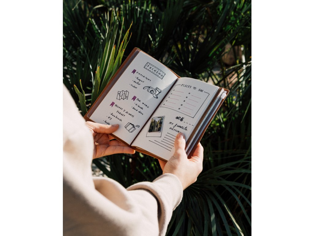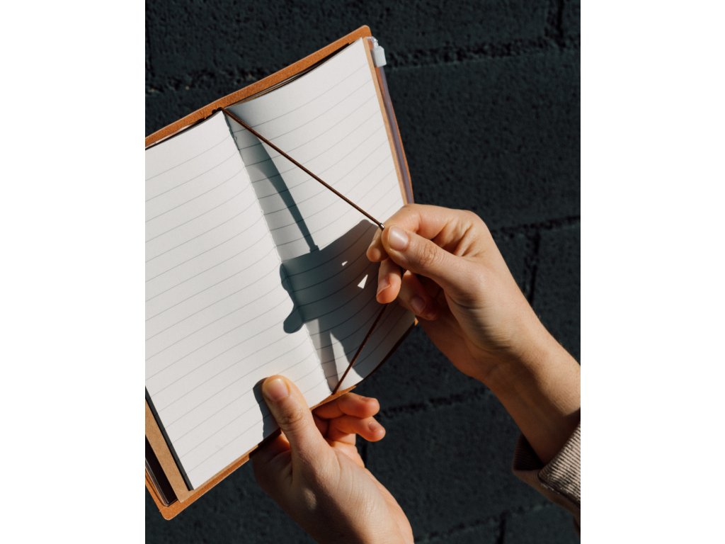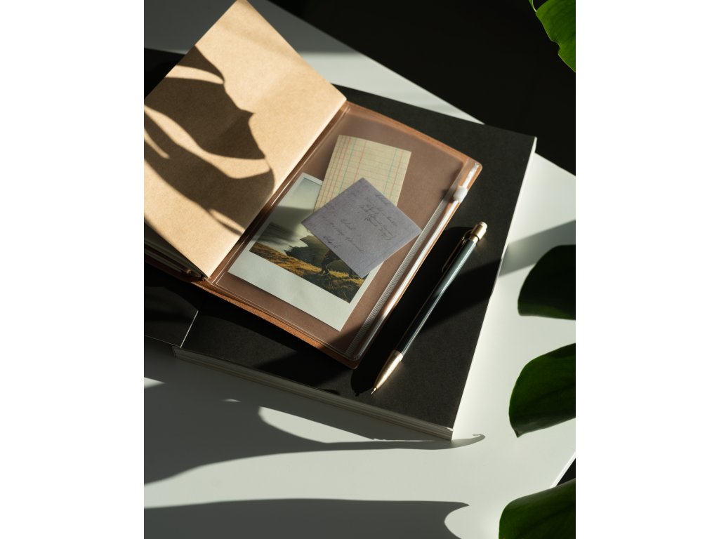 Cestovní zápisník s měkkým polyuretanovým obalem. Obsahuje prostor na karty, dva vyměnitelné sešity s 80 listy (160 stran) a dvěma různými typy listů (s odrážkami a linkovanými) a kapsu na vnitřní straně zadní strany. Má gumičku a polyuretanové zapínání. Obálky měří 12 x 19,5 cm a vnitřní strana 10,5 x 18,5 cm.Doplňkové parametry