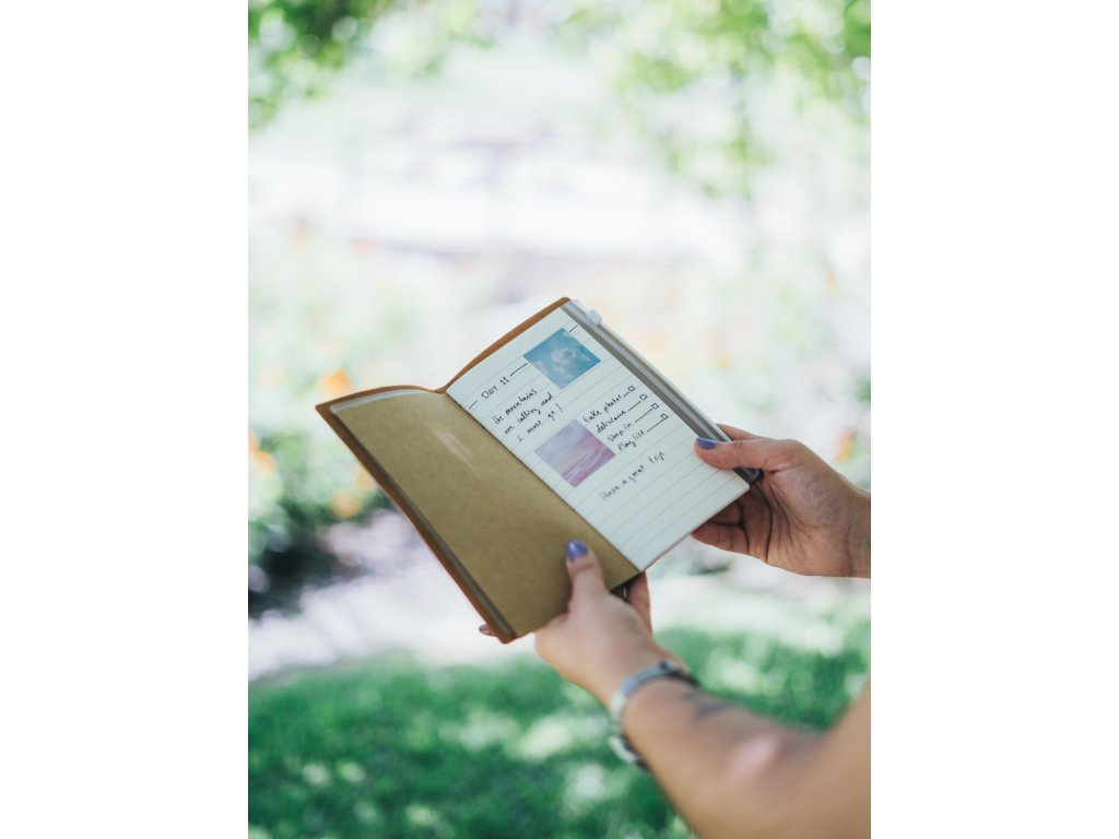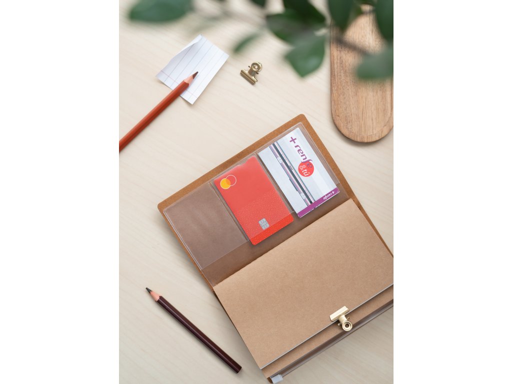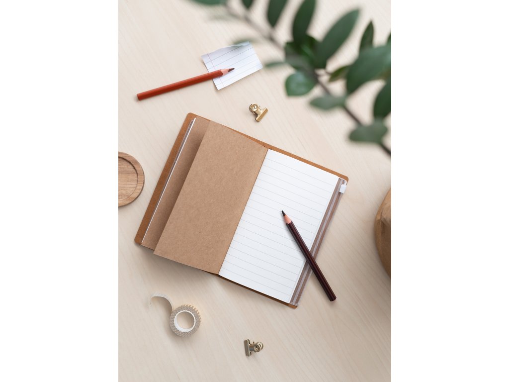 Cestovní zápisník s měkkým polyuretanovým obalem. Obsahuje prostor na karty, dva vyměnitelné sešity s 80 listy (160 stran) a dvěma různými typy listů (s odrážkami a linkovanými) a kapsu na vnitřní straně zadní strany. Má gumičku a polyuretanové zapínání. Obálky měří 12 x 19,5 cm a vnitřní strana 10,5 x 18,5 cm.