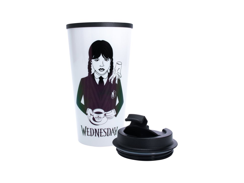 Cestovní hrnek s oblíbeným motivem Wednesday. Hrnek není vhodný do myčky nádobí a mikrovlnné trouby.