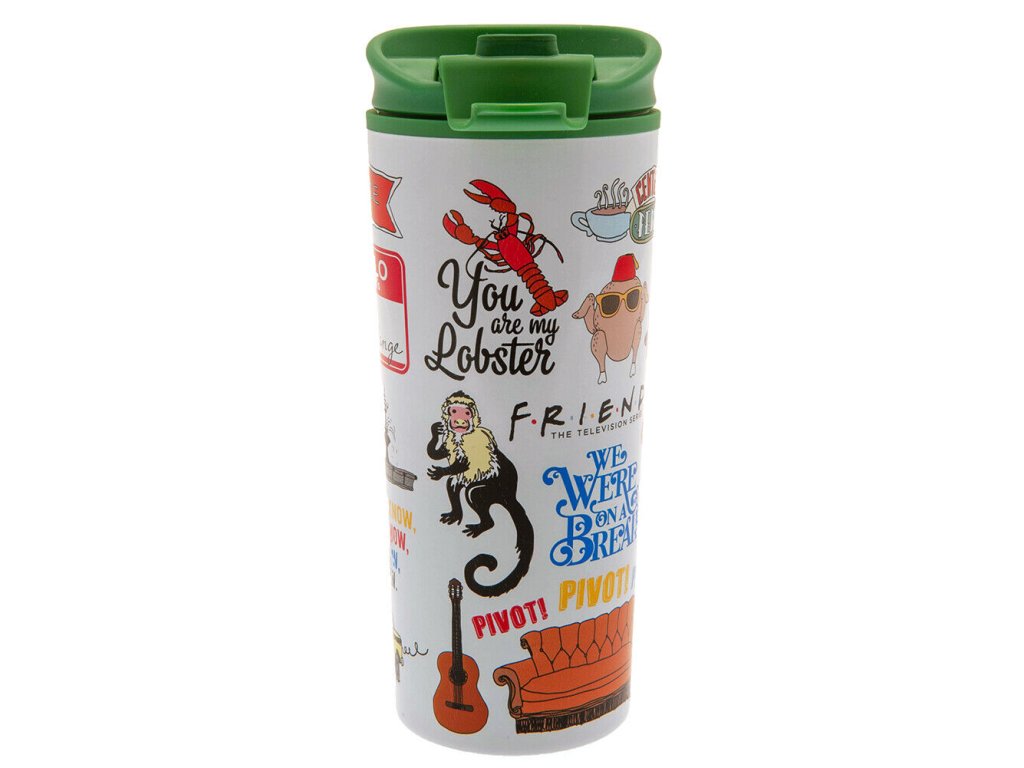 Cestovní nerezový hrnek s ikonickými motivy a hláškami ze seriálu Přátelé. Hrnek není vhodný do myčky ani mikrovlnné trouby.Doplňkové parametry