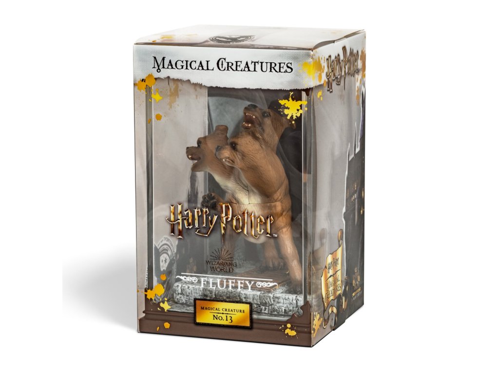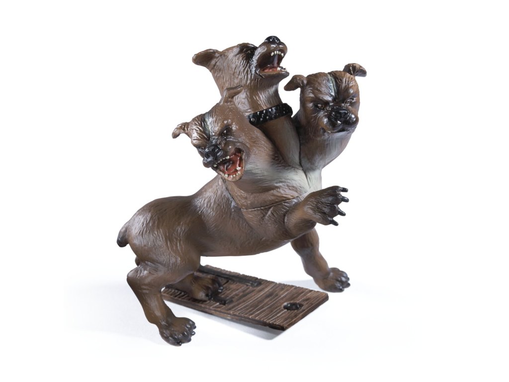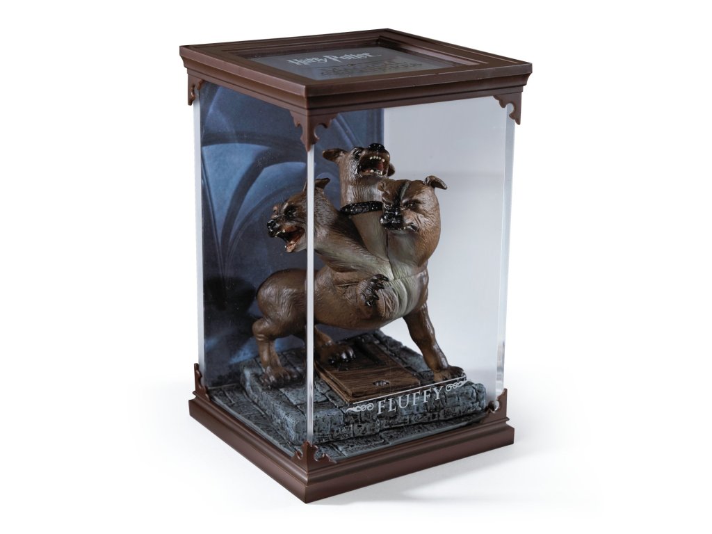 Sběratelská figurka v průhledné vitríně - trojhlavý pes Chloupek. Je to Hagridův mazlíček, který hlídal v prvním díle vchod do míst, kde byl ukrytý Kámen mudrců.