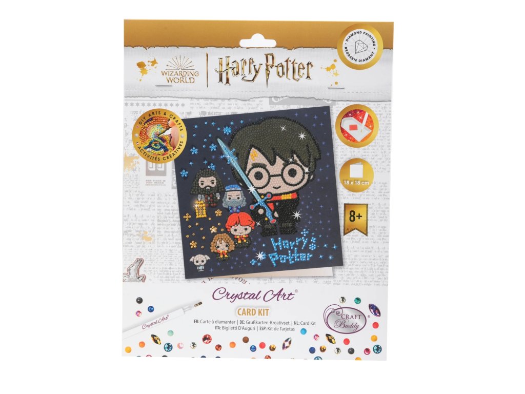 Produkty značky Crystal Art jsou ideálním dárkem pro každou kreativní duši. Tvoření pomocí nalepování krystalů je dobrým relaxem a odpočinkem pro dospělé a skvělou zábavou pro děti, které se mohou zdokonalovat ve zručnosti. Výslednou odměnou je pak jedinečný výtvarný výrobek - v tomto případě pak 18 x 18 cm pohlednice, na které je znázorněni blízcí přátelé Harryho Pottera.