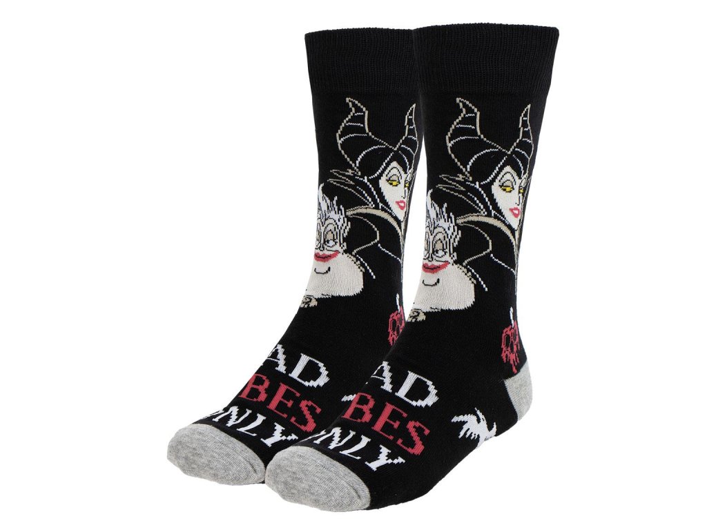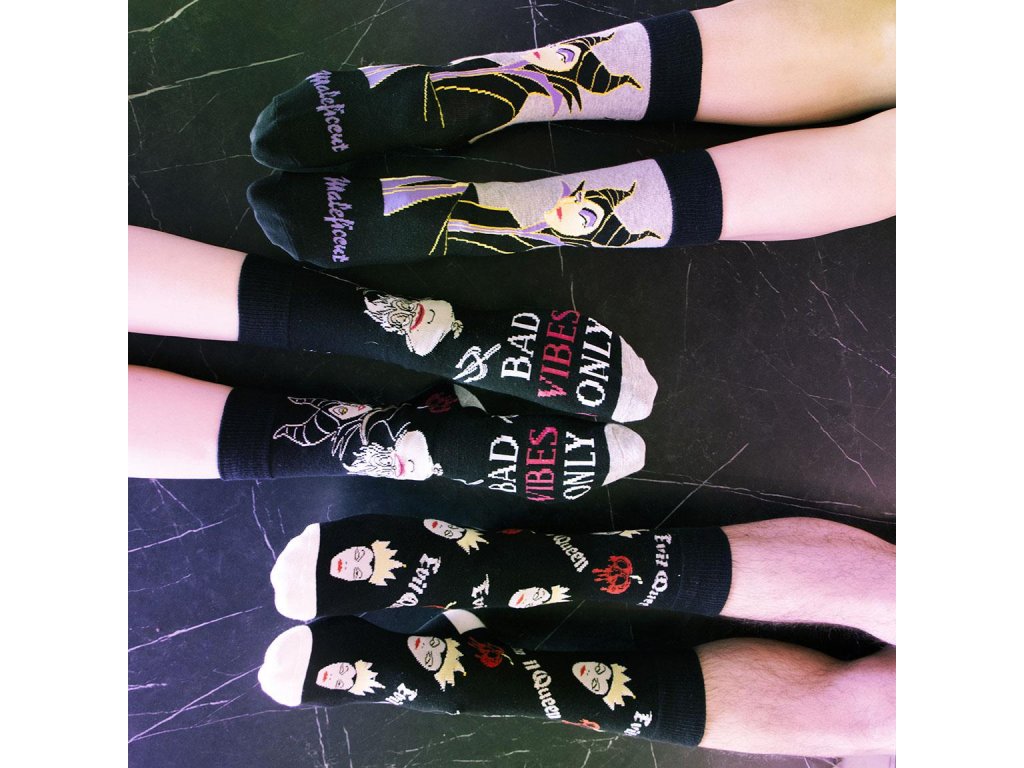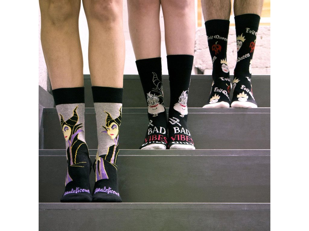 Sada tří párů (vel. 36-43) ponožek s motivy Disney Villains, inspirovanými Zlobou a zlou královnou, nabízí kombinaci pohodlí a stylu. Jsou vyrobeny z měkkého, prodyšného materiálu, který zajišťuje příjemné nošení, a originální design potěší fanoušky ikonických záporáků.