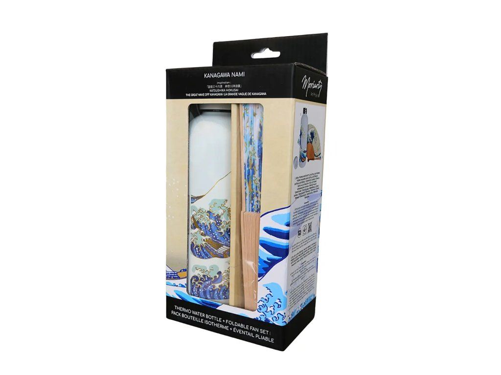 Ponořte se do japonské elegance s touto exkluzivní sadou inspirovanou slavnou Velkou vlnou u pobřeží Kanagawy. Elegantní a praktická sada v sobě spojuje dva rafinované doplňky, které kombinují styl a každodenní funkčnost: 500 ml termoláhev vyrobená z nerezové oceli udrží nápoje teplé nebo studené po několik hodin, zatímco vějíř z přírodního bambusu je lehký, skládací a snadno se vejde do tašky nebo kapsy. Jejich elegantní designy se dokonale doplňují a v úhledné dárkové krabičce představují ideální dárek pro každou příležitost.Doplňkové parametry