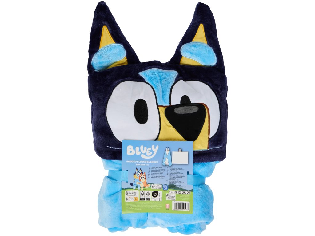 Zabav se i zahřej s touto měkoučkou dekou s kapucí a motivem populární postavičky Bluey! Ideální jako doplněk do dětského pokoje, na sledování filmů, hry, cestování i večerní odpočinek.