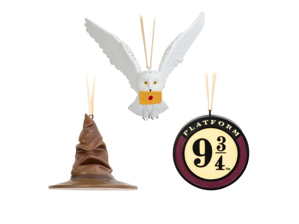 Dodejte svému svátečnímu zdobení trochu kouzla s touto ozdobou na vánoční stromeček na motivy Harryho Pottera a obsahující oblíbené kouzelné předměty a stvoření z kouzelnického světa - Moudrý klobouk, Nástupiště 9 a 3/4 a sovu Hedviku.