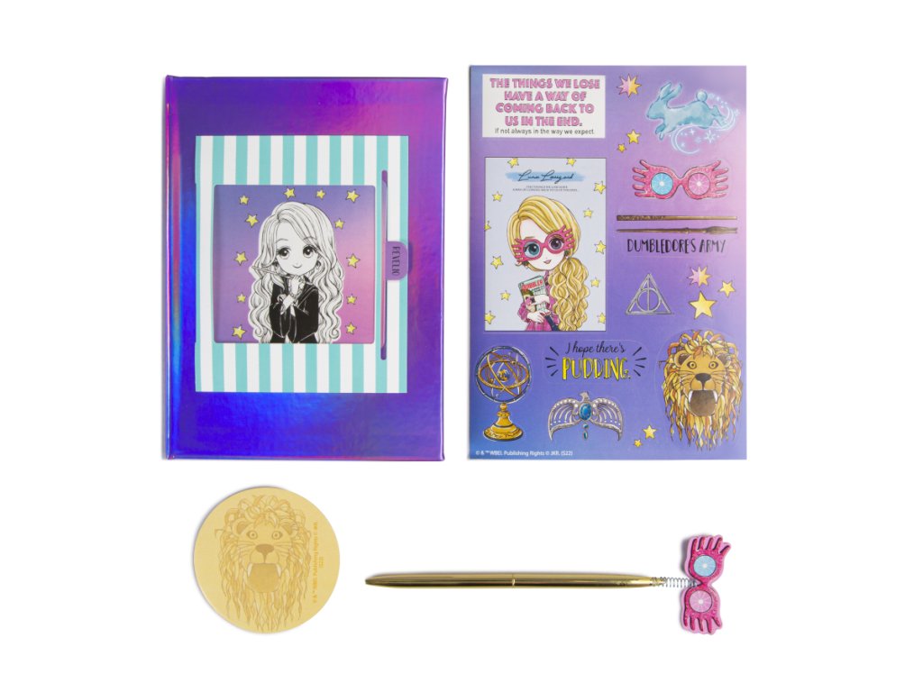 Deník sada Harry Potter Revelio – vítejte ve fascinujícím kouzelnickém světě s deníkem Harryho Pottera! Tento deník vás přenese do kouzelného světa Bradavic a umožní vám znovu prožívat oblíbené okamžiky. Sada obsahuje – deník, pero s topperem, samolepky.