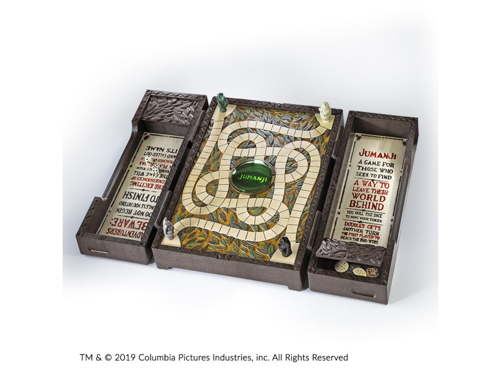 Krásně zpracovaná replika ikonické deskové hry Jumanji v plné velikosti s návodem a příslušenstvím pro vzrušující hraní pro 2–4 hráče. Dodává se s totemy, kostkami a hracími kartami. Hrací deska měří po zavření přibližně 41 x 28 x 10 cm.Doplňkové parametry