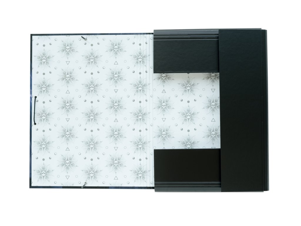 Složka má zapínání na gumičku a 2mm kartonovou desku s matným laminovaným papírem o gramáži 150 g/m². Rozměry 34 x 25,5 cm a obsahuje 3 flexibilní klopy, dvě o rozměrech 23 x 13 cm a jednu o rozměrech 34 x 13 cm.Doplňkové parametry