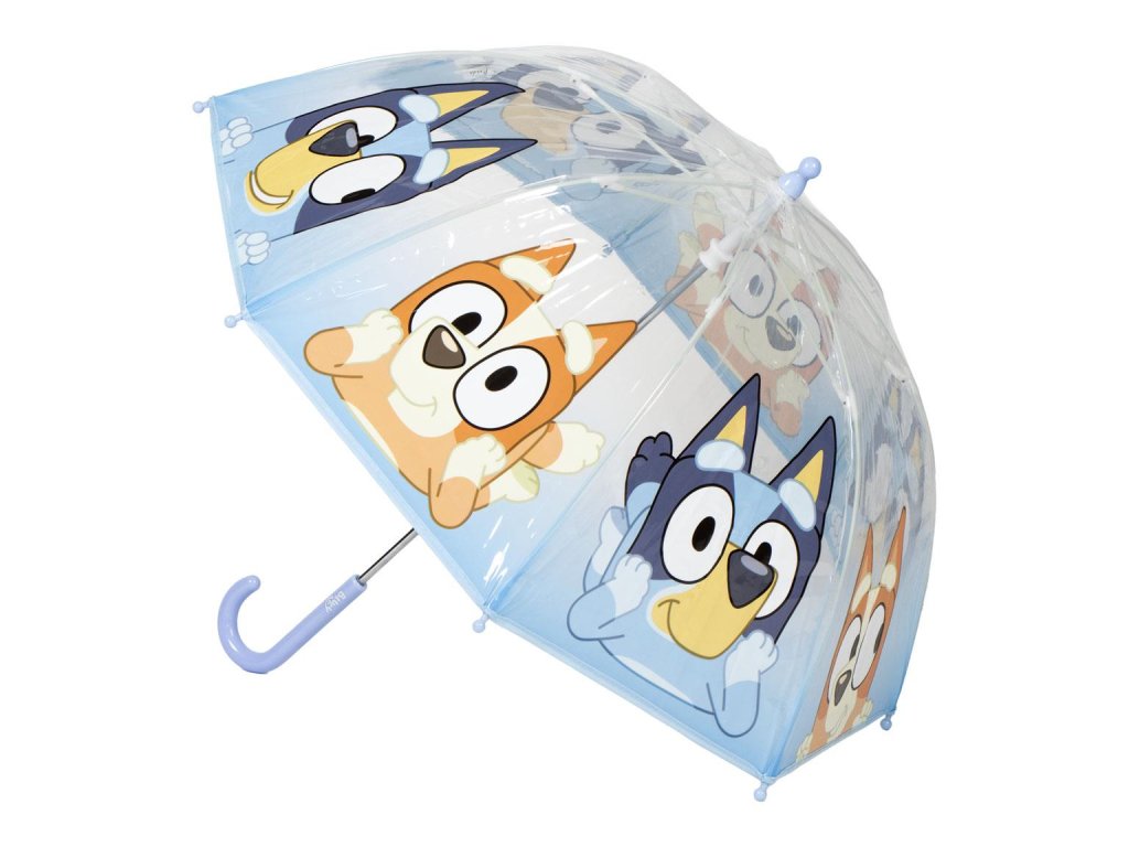 Praktický dětský deštník s motivem Bluey, navržený pro malé fanoušky. Jeho průhledná kopule zajišťuje lepší výhled a vyšší ochranu před deštěm.