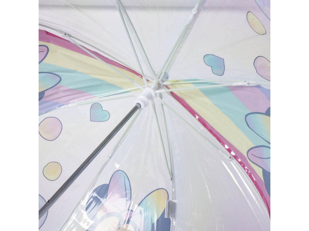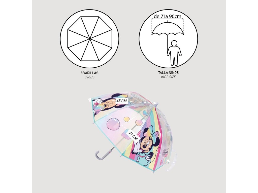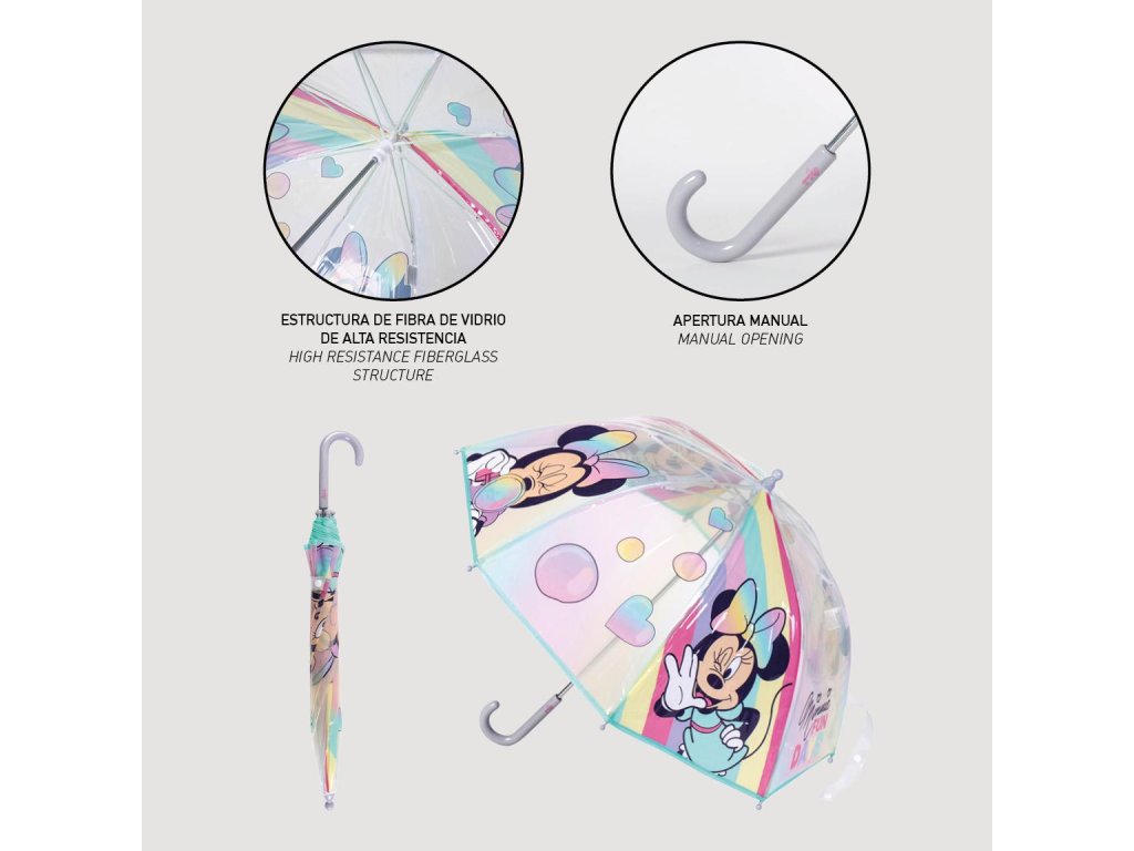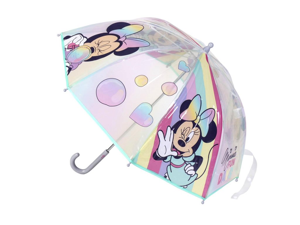 Průsvitný deštník s motivem Minnie nabízí ochranu před deštěm a oblíbený design pro fanoušky Mickey Mouse. Veselý a barevný motiv dodává deštivým dnům hravý a zábavný nádech.Doplňkové parametry