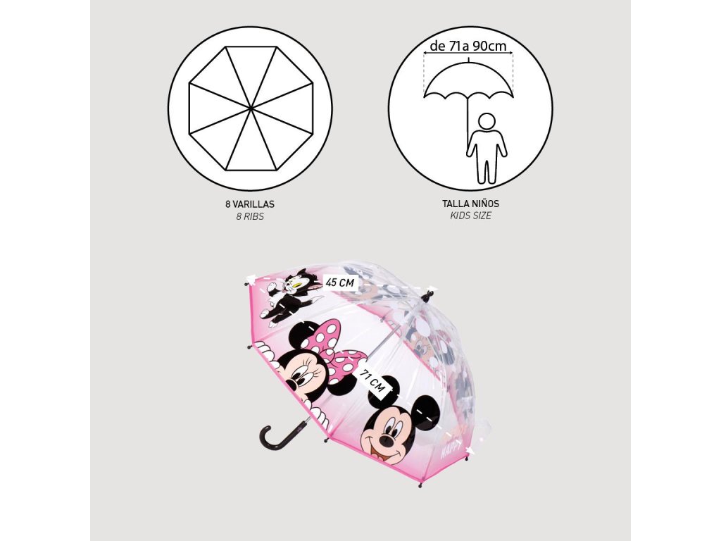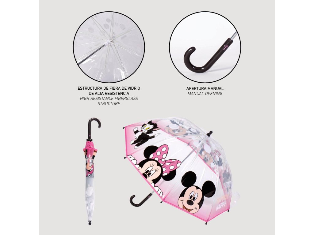 Průsvitný deštník s motivem Minnie a Mickeyho nabízí ochranu před deštěm a oblíbený design pro fanoušky Mickey Mouse. Veselý a barevný motiv dodává deštivým dnům hravý a zábavný nádech.Doplňkové parametry