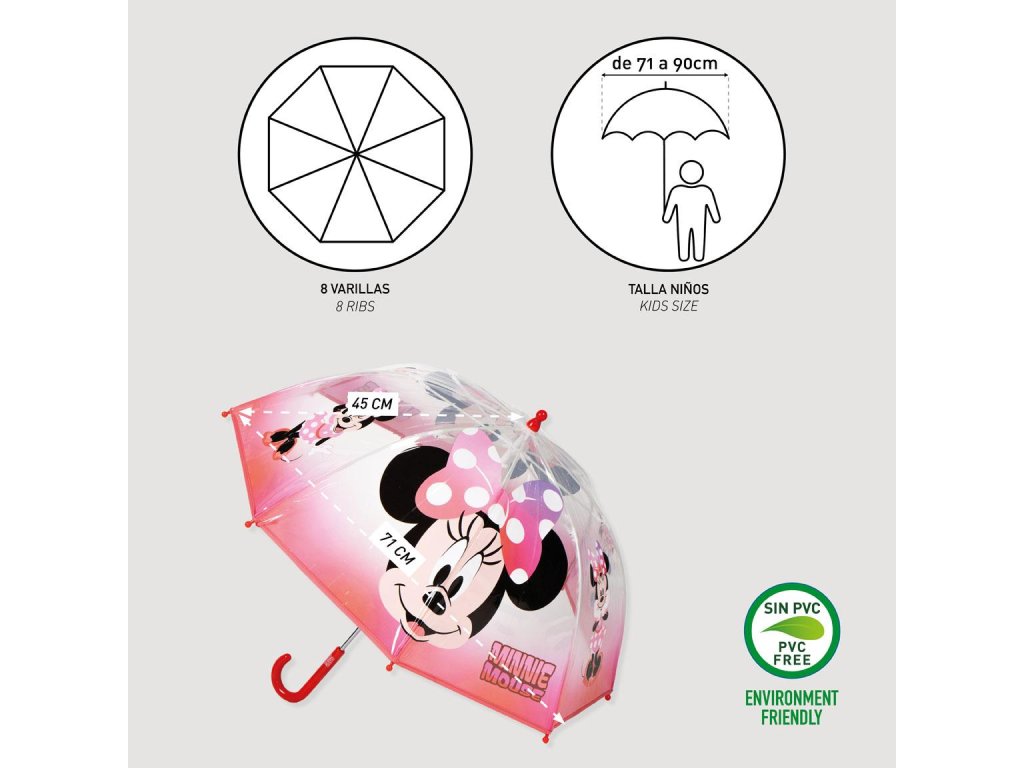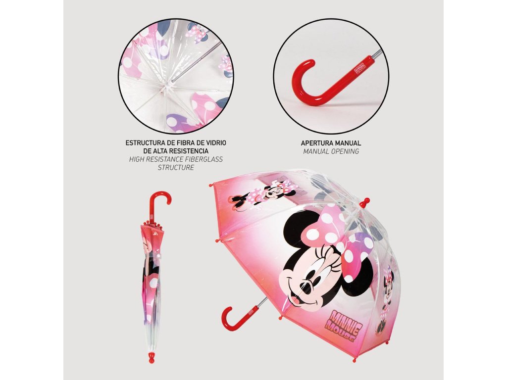 Průsvitný růžový deštník s motivem Minnie nabízí ochranu před deštěm a oblíbený design pro fanoušky Mickey Mouse.Doplňkové parametry