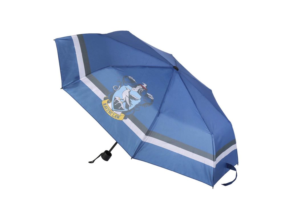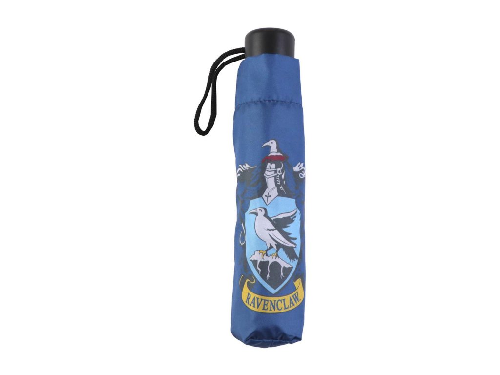 Modrý skládací deštník s grafikou havraspárského erbu z filmu Harryho Pottera.