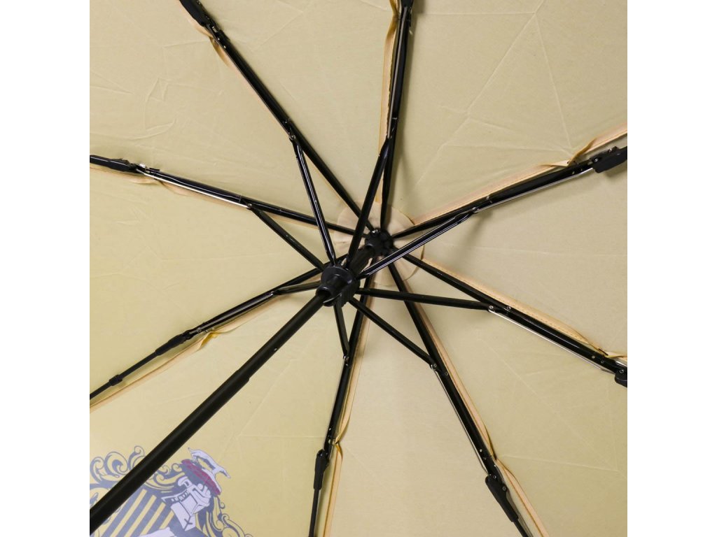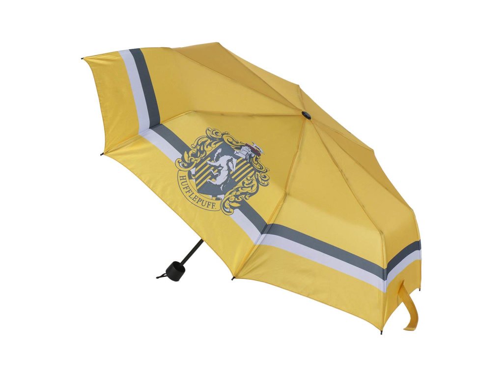 Žlutý skládací deštník s grafikou mrzimorského erbu z filmu Harryho Pottera.