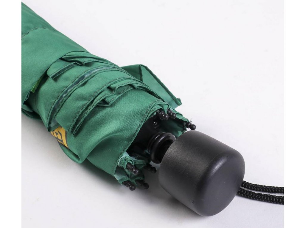 Zelený skládací deštník s grafikou zmijozelského erbu z filmu Harryho Pottera.