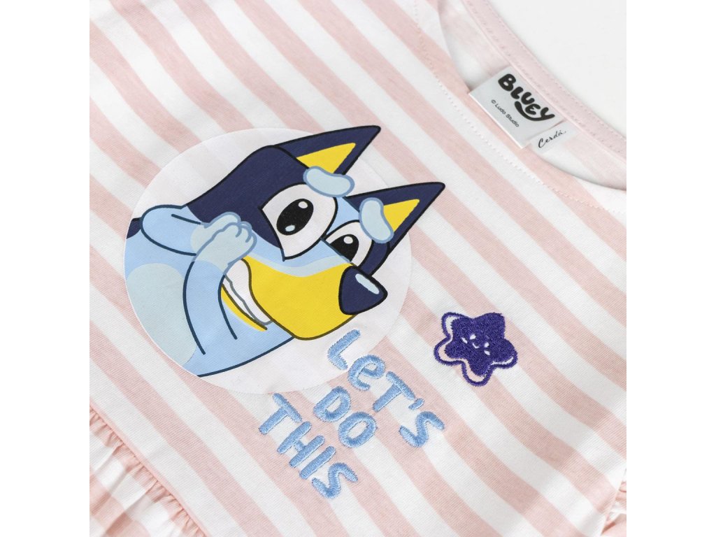 p>Pohodlné dětské šaty s motivem Bluey, vyrobené z jemného single jersey materiálu a ideální volba na běžné nošení i volnočasové aktivity. Materiál zajišťuje pohodlí a přirozený pohyb, zatímco grafika s postavičkou Bluey dodává roztomilý a výrazný styl.Kvalitní a stylový kousek pro fanoušky Bluey, který spojuje jednoduchý střih a oblíbený motiv.