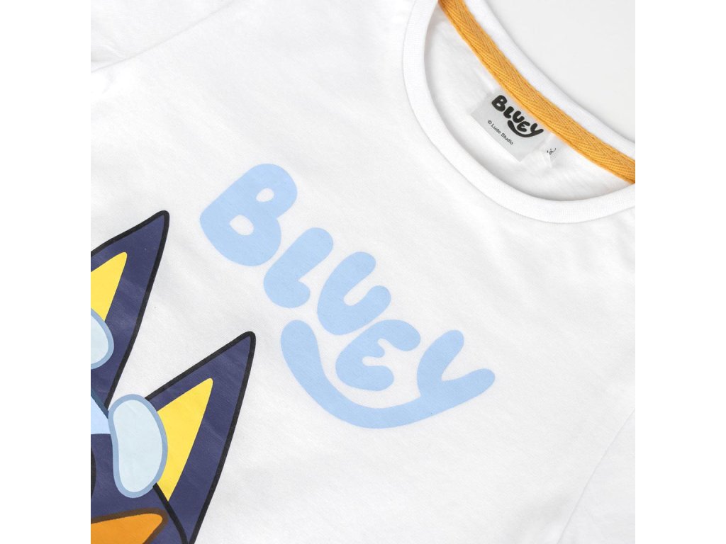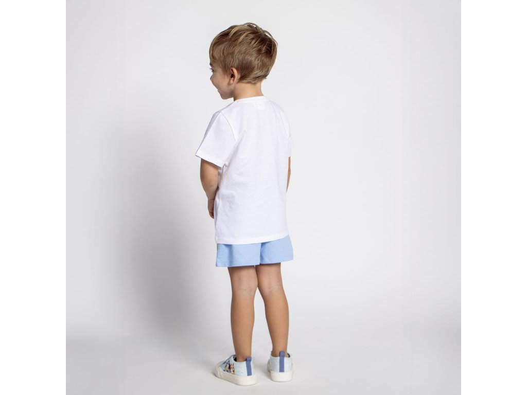 Pohodlný set zahrnuje triko s krátkými rukávy a kraťasy, obojí s motivem Bingo a Bluey. Vyrobený z měkkého french terry materiálu, je ideální pro volný čas i domácí nošení.