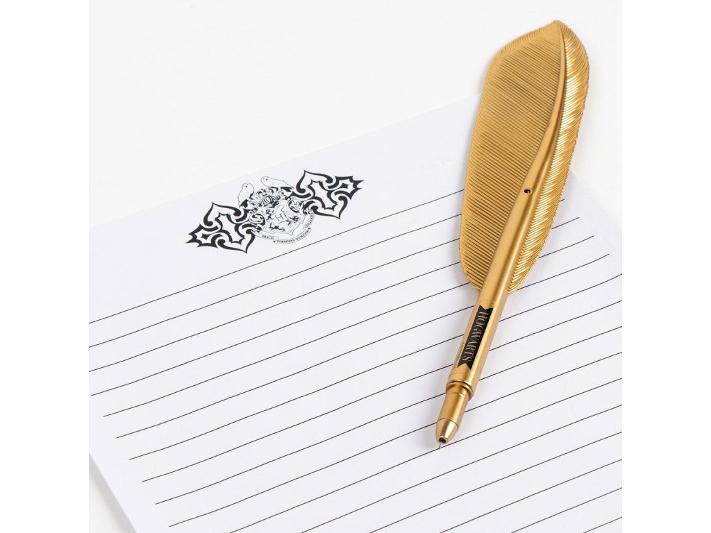 Dopisní set obsahuje 8 dopisních papírů, 8 obálek, set zlatých samolepek ve stylu pečetě a zlatý psací brk/propisku.