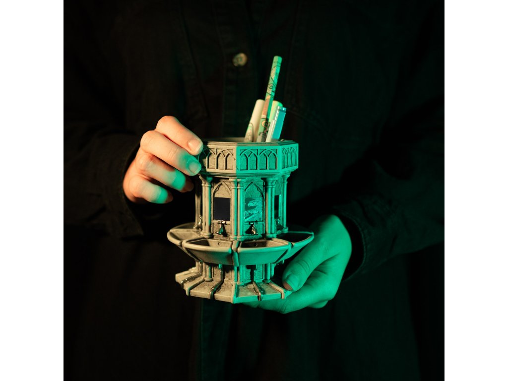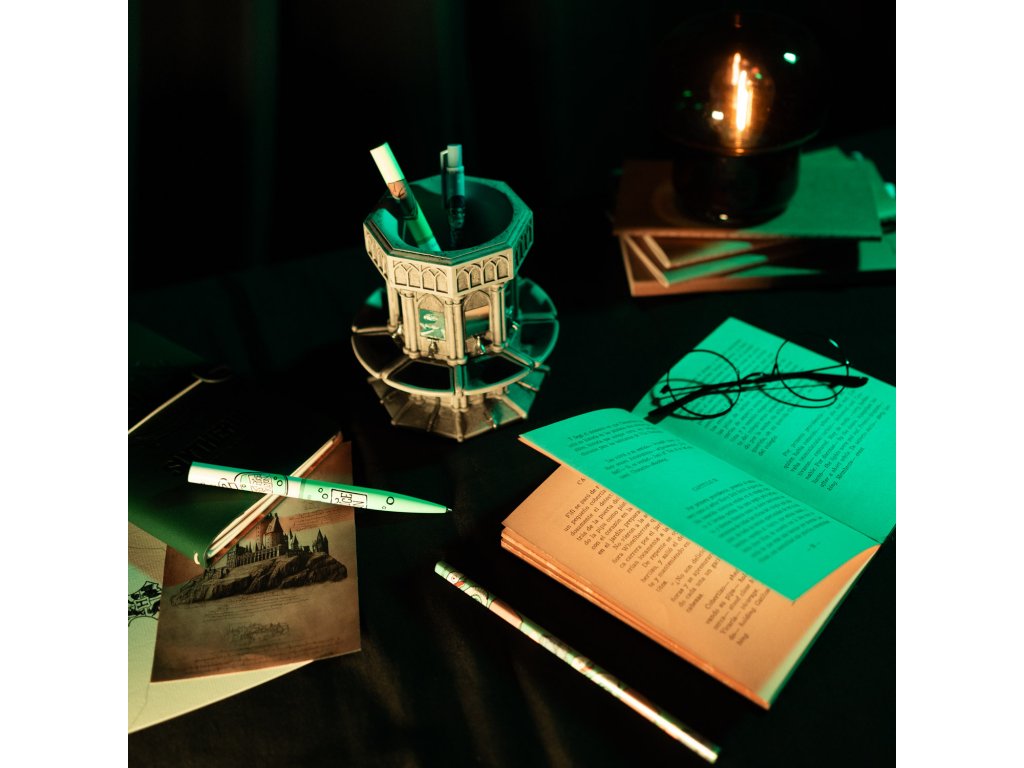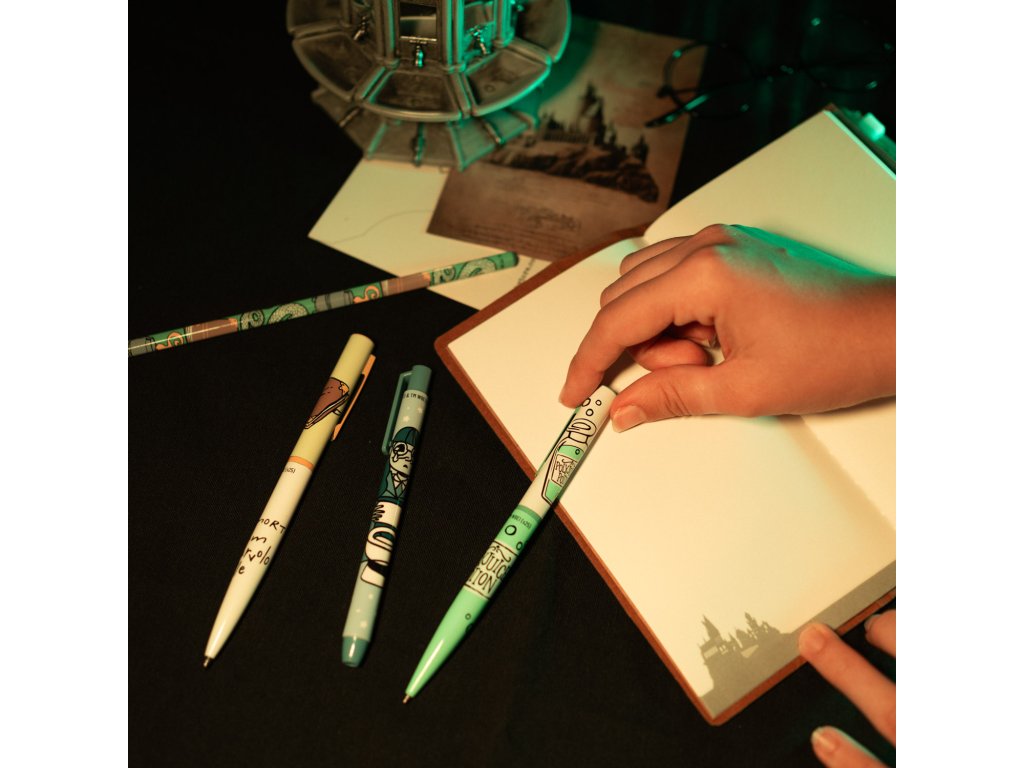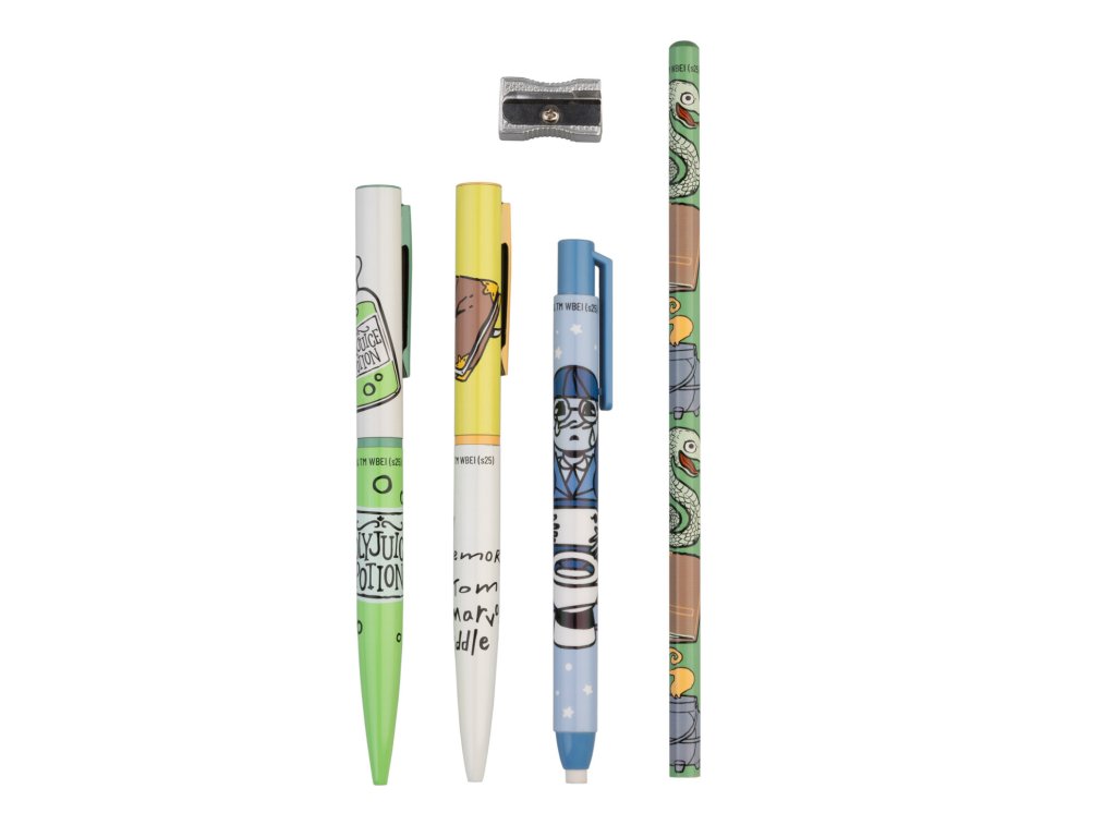 Sada sestávající z 3D držáku na pera a odpovídající sady papírenských potřeb. Držák na pera je vyroben z pryskyřice, ručně malovaný a měří 12,8 x 12,6 x 12,8 cm. Sada papírenských potřeb obsahuje 2 kuličková pera (jedno s černým inkoustem a jedno s modrým inkoustem), 1 tužku, 1 držák na gumu a 1 ořezávátko – vše je zdobeno tak, aby ladilo s designem a tématem držáku na pera a licencované postavičky.Doplňkové parametry