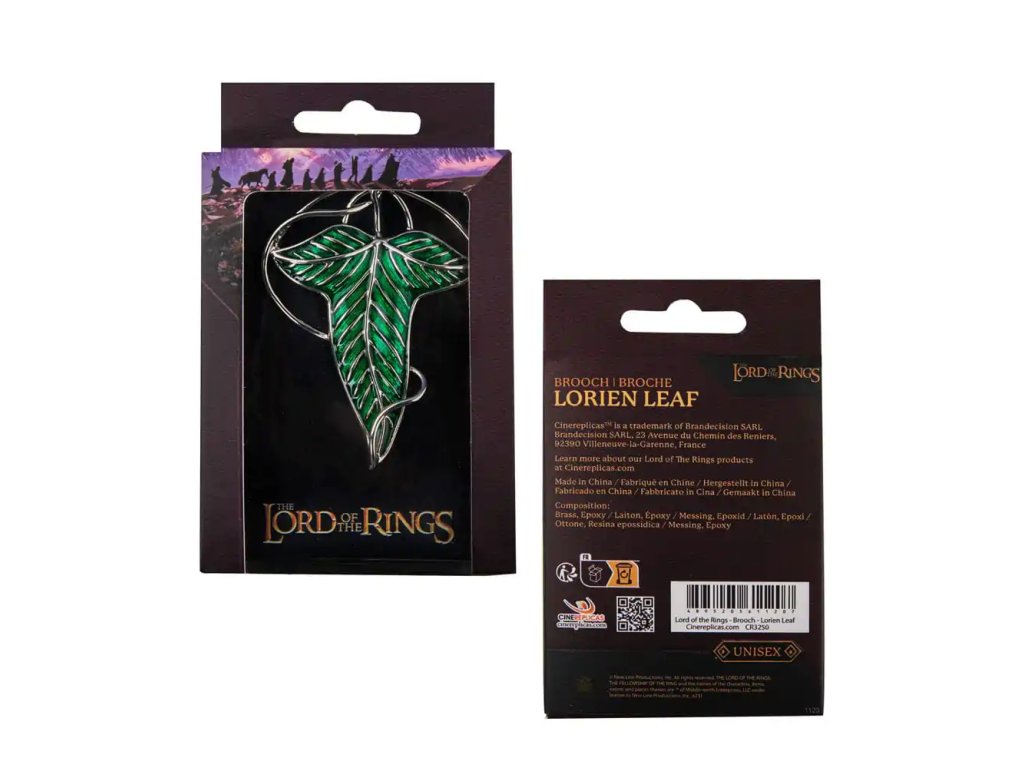 Elfská brož z Loriénu je poctou světu Středozemě a symbolizuje ducha i pouto těch, kteří byli pověřeni jeho ochranou. Vyrobena z kombinace mosazi a epoxidu, zobrazuje lesklé stříbrné révy elegantně obtáčející zelený list – charakteristický symbol elfů z Lothlórienu.