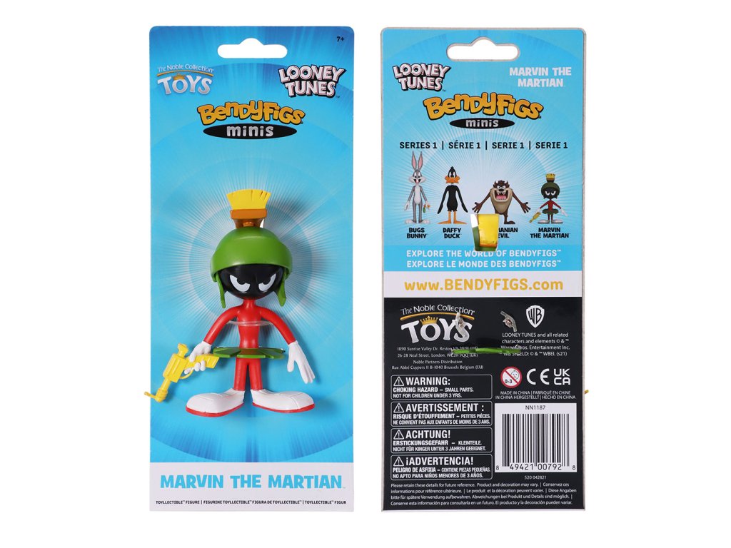 Noble Toys představuje novinku v řadě miniaturních figurek Bendyfigs™ inspirovaných oblíbeným televizním seriálem Looney Tunes. Tato miniaturní Bendyfig s Marvin the Martian měří přibližně 11 cm na výšku. Minifigky Bendyfigs jsou menší než Bendyfigs v plné velikosti a nedodávají se s stojánkem, ale jsou připevněny k balíčku s kartony. Figurky Bendyfigs™ jsou zábavné pro děti a detailní sběratelský kousek pro fanoušky všech věkových kategorií. Doporučený věk 7+.Doplňkové parametry