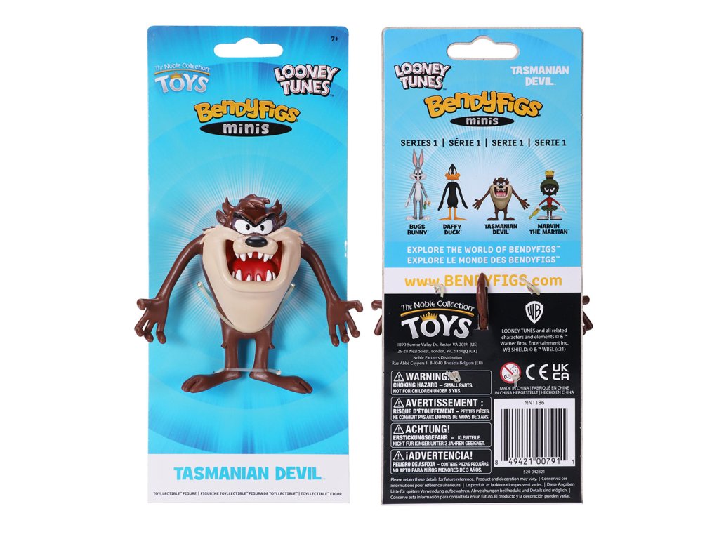 Noble Toys představuje novinku v řadě miniaturních figurek Bendyfigs™ inspirovaných oblíbeným televizním seriálem Looney Tunes. Tato miniaturní Bendyfig s Tazem měří přibližně 11 cm na výšku. Minifigky Bendyfigs jsou menší než Bendyfigs v plné velikosti a nedodávají se s stojánkem, ale jsou připevněny k balíčku s kartony. Figurky Bendyfigs™ jsou zábavné pro děti a detailní sběratelský kousek pro fanoušky všech věkových kategorií. Doporučený věk 7+.Doplňkové parametry