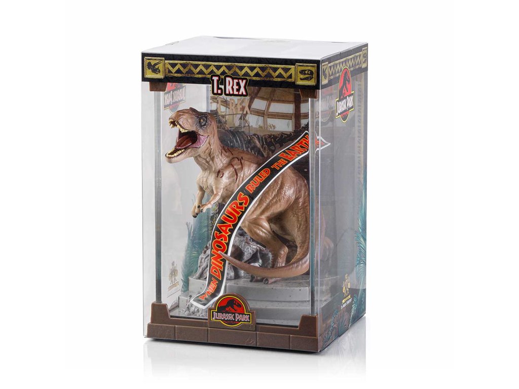 Impozantní Tyrannosaurus Rex z Jurského parku ožívá v tomto precizně zpracovaném diorámatu. Pouzdro lze odejmout a dinosaurus je také odnímatelný ze základny. Dioráma měří přibližně 18 cm na výšku. Sesbírejte všechny 3 dinosaury – Tyrannosaura Rexe, Velociraptora a Dilophosaura!Doplňkové parametry