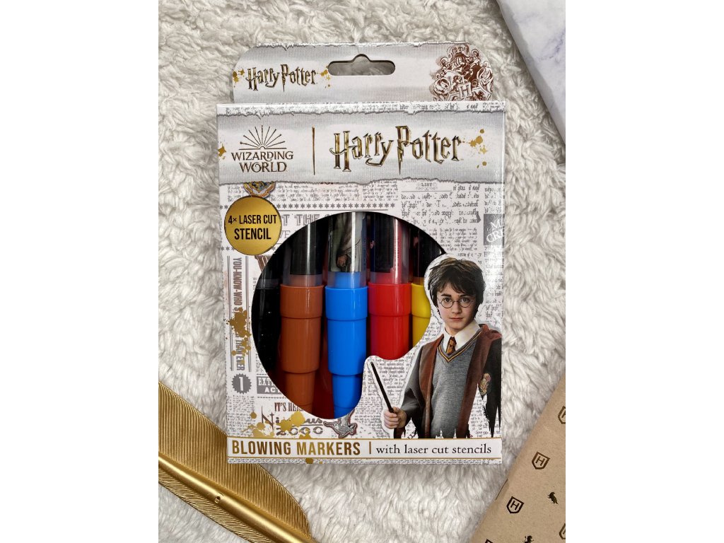 Balení obsahuje 6 barevných foukacích fixů a 4 barevné papírové šablony v oblíbených motivech knižní a filmové ságy Harry Potter.
